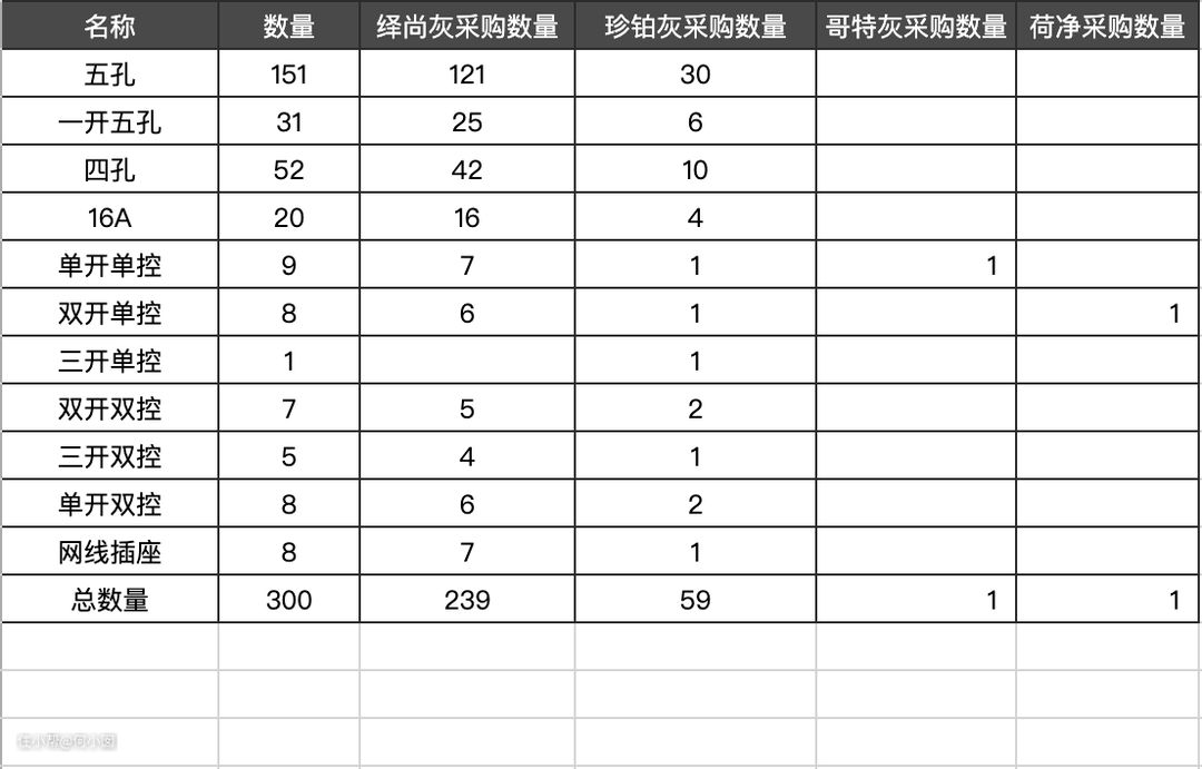 常见的搭配方案是高端开关搭配同色的中低端插座。比如使用珍铂开关搭配绎尚或者皓呈的插座,这种方案大概会省掉50%,如果我使用珍铂烟云灰+皓呈灰的方案,总价在8500左右。