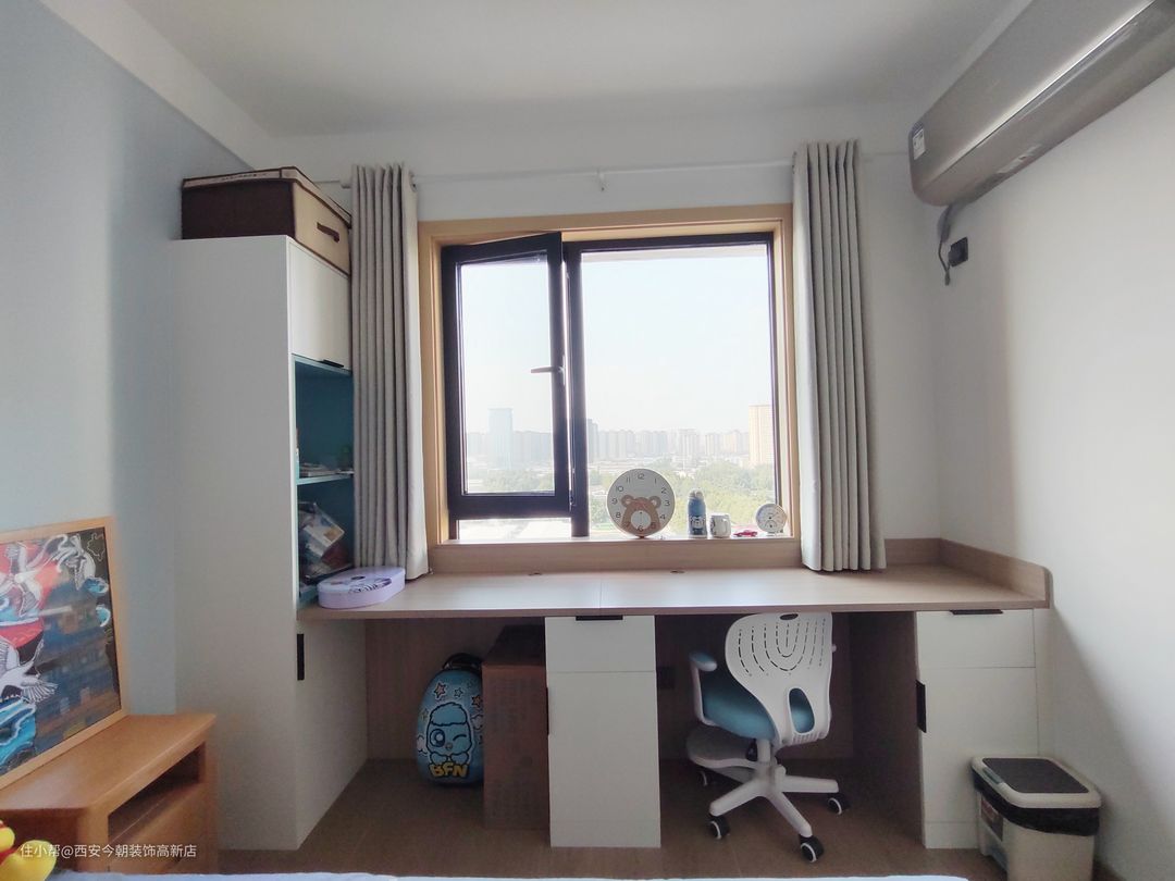 如果有飘窗的话,建议飘窗向室内延伸一段距离直接设计成书桌。下方做抽屉,心机之处在于转角处,打造书桌和书柜一体的设计。这样的设计同时兼具了书桌+书柜的功能。