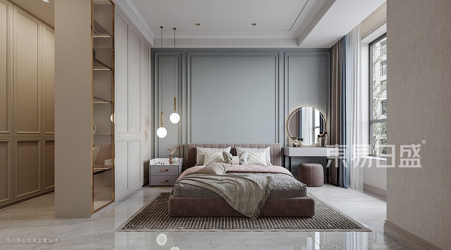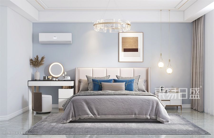 整体冷色基调,比灰蓝色更淡,更偏灰,这个颜色的床头背景墙,即使是在阴天,也能让卧室空间拥有柔和温暖的氛围,与装饰画搭配,看起来也更加的精致。