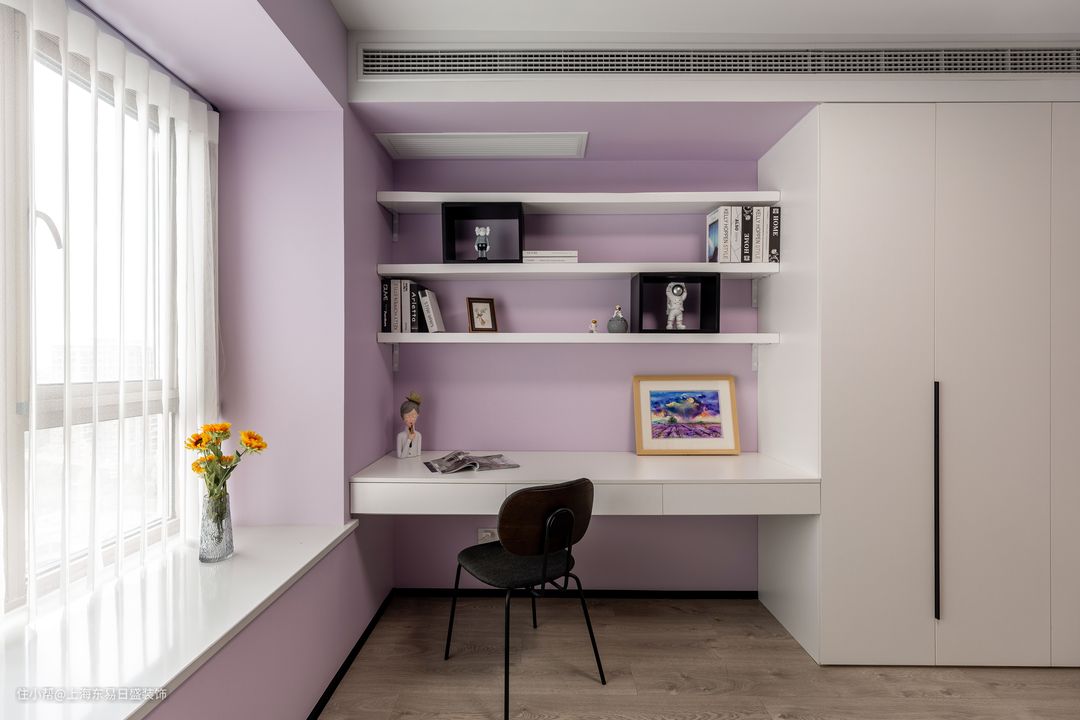 儿童房首要考虑睡眠的舒适度,其次就是储物功能。顶天立地式的衣柜可以尽可能提高垂直空间的利用率,一系列衣物都能放得下。另外,如果家里没有单独的书房,儿童房需要安静独立的学习空间,可以沿着窗边或窗外做一面书桌,上方设置柜体,学习或是办公都比较方便。