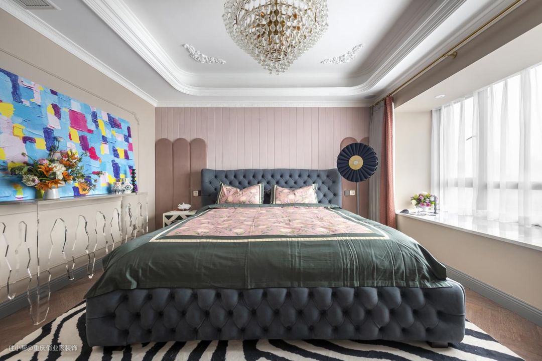 主卧床头背景墙采用粉色,粉色代表浪漫、温柔,用在温柔知性的女主人房间在合适不过,搭配深灰色软包大床,不失为一个个性的尝试。