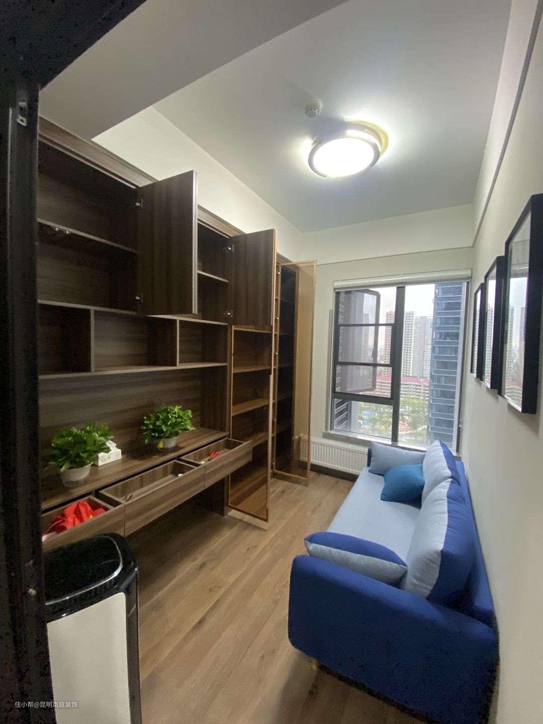 最小的卧室做了独立书房,一整面的到顶储物柜,全屋都是做的定制家具,组合衣柜书桌一体式的设计,让这个空间不止是单一的书房,也是一个独立衣帽间,另外设计师选择的沙发也是可以打开做床,是一个真正的多功能房。