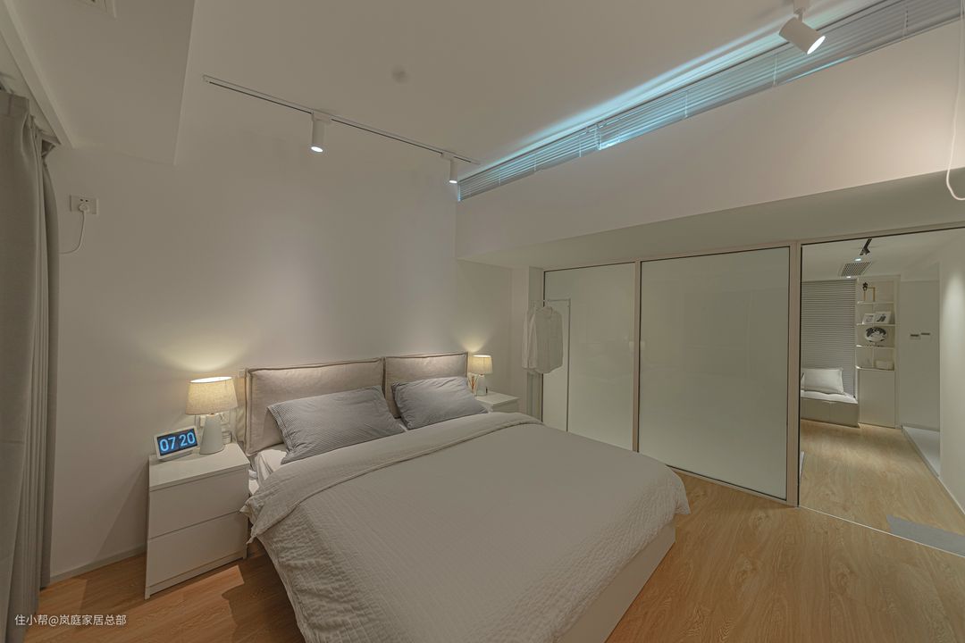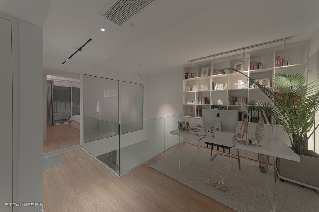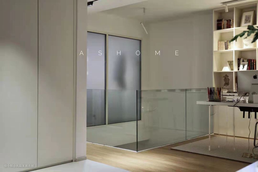 书房和卧室之间有用白色过门石来进行隔断,增加了空间的独立性和立体性。卧室墙面上选择了不透明的磨砂玻璃作为隔断,既有一定的透光性,增加室内光线,又可以保证卧室的隐私。