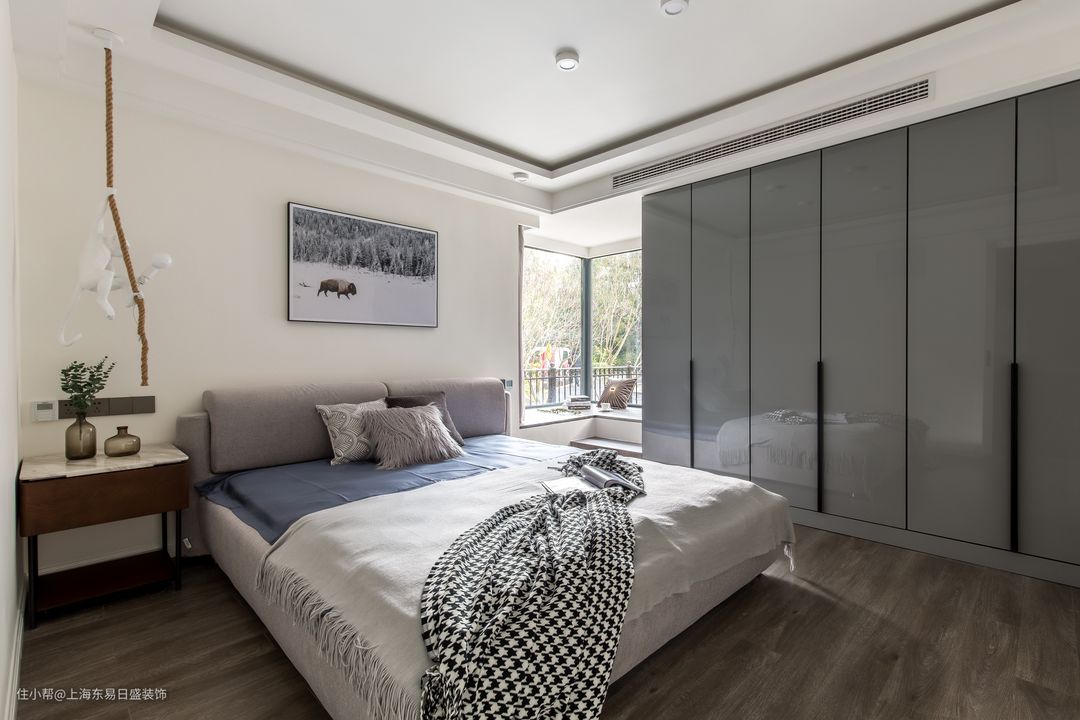定制衣柜通常结合卧室的形状来设计,比如这间次卧将床头柜和衣柜的功能结合起来,L形衣柜与床头处于同一平面,床侧边掏空一部分,留出开关插座和放置摆件的空间,整体非常方便实用。