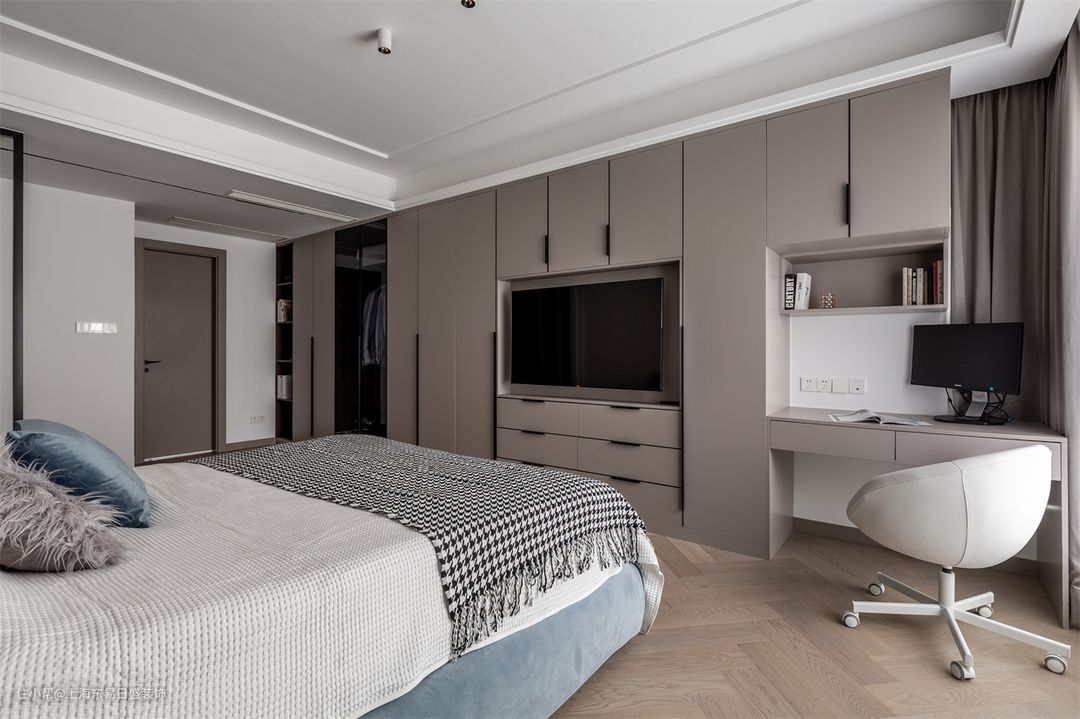 沿着床尾做一整排衣柜,可以将电视嵌入其中,靠近窗户处还可以延伸一块梳妆台,保证风格的统一完整,视觉上也更简洁大方。床尾衣柜比较适合面积大的卧室,宽度至少要在3米以上,这样进出活动都比较舒适。