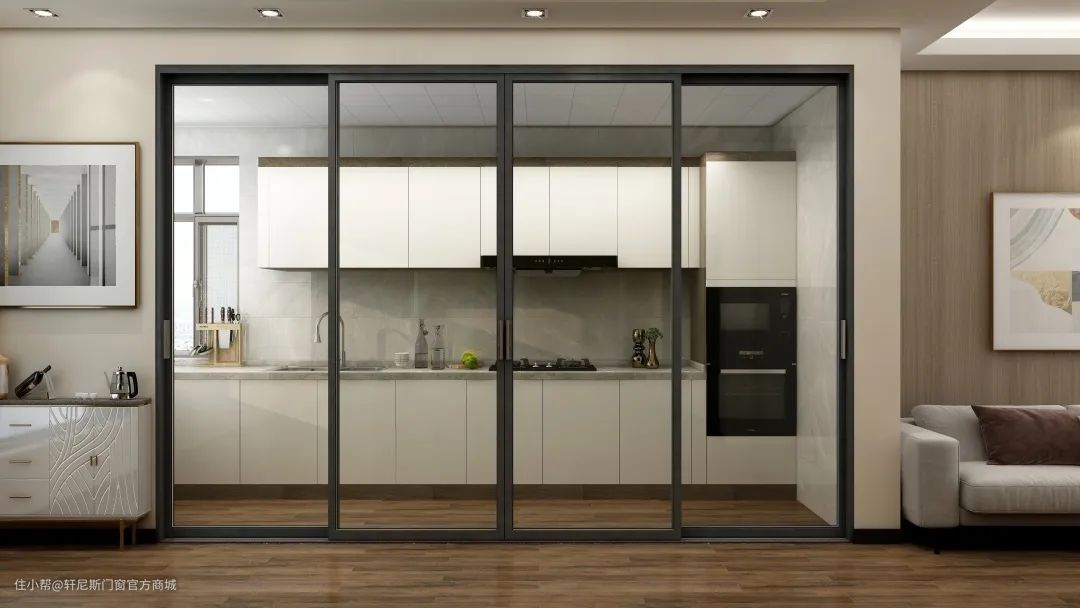 如果厨房空间比较小,也可以考虑三联动推拉门,不仅可以最大限度开启门扇,还不会占用过多室内空间。