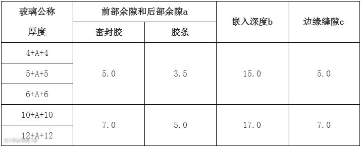 单片玻璃、夹层玻璃和真空玻璃的最小装配尺寸(mm)