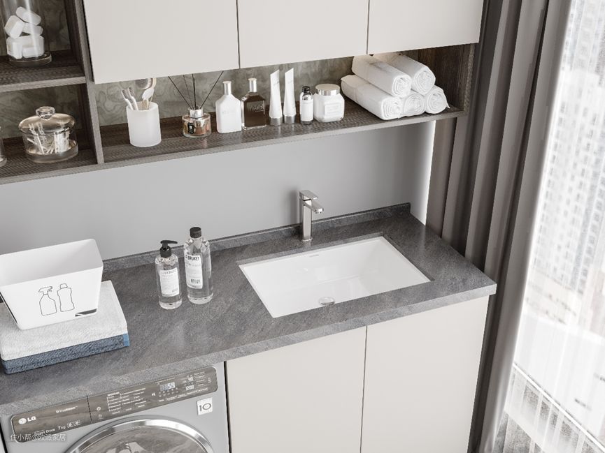 洗衣机嵌入台面底部,旁边设计洗手盆,方便清洁衣物和一些小物品。