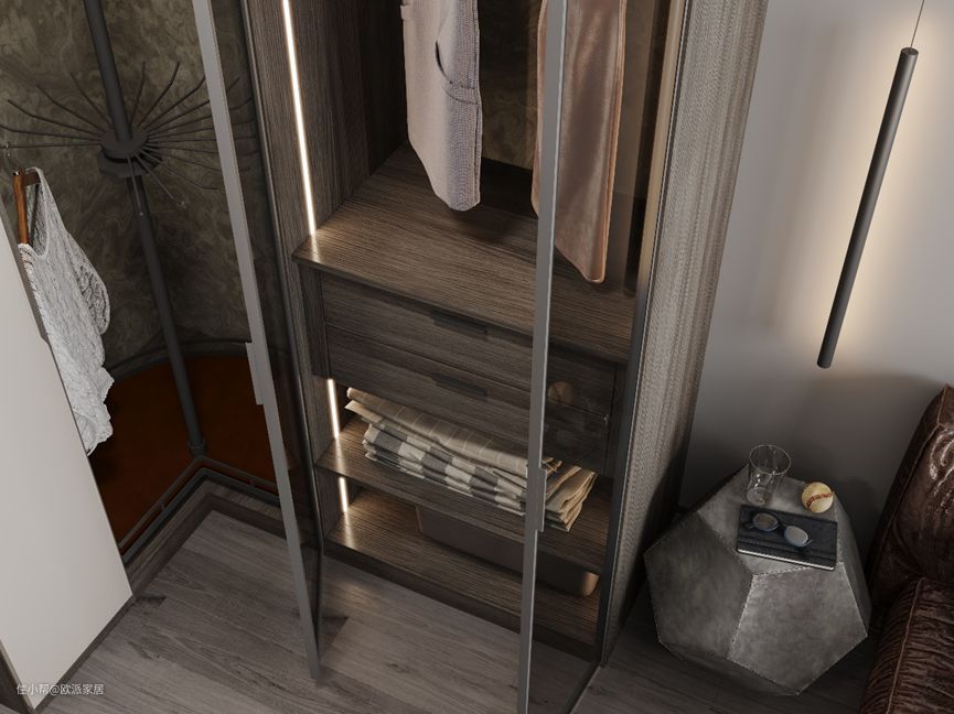 主卧空间有限,利用墙角定制L型到顶衣柜。侧边是一门到顶的高柜和开放旋转衣架,方便拿取常用衣物的同时,也能更好利用转角空间。