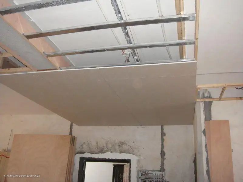 石膏板安装从顶棚中间顺主龙骨方向开始,石膏板长边与主龙骨方向一致,向两侧伸延分行。