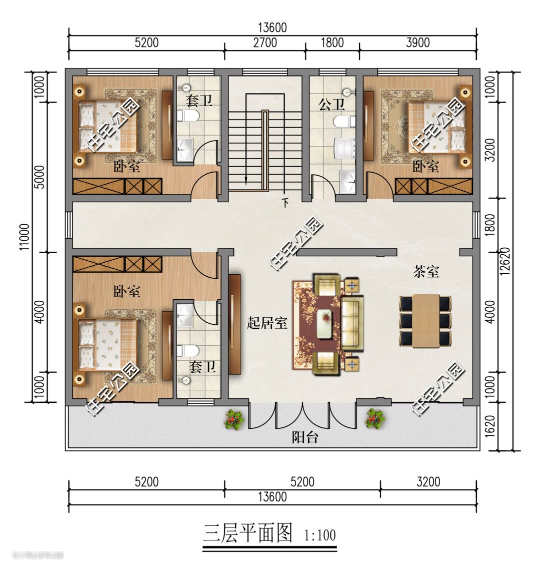 三层增设了3间卧室,在过年过节时,也方便亲戚朋友留宿。