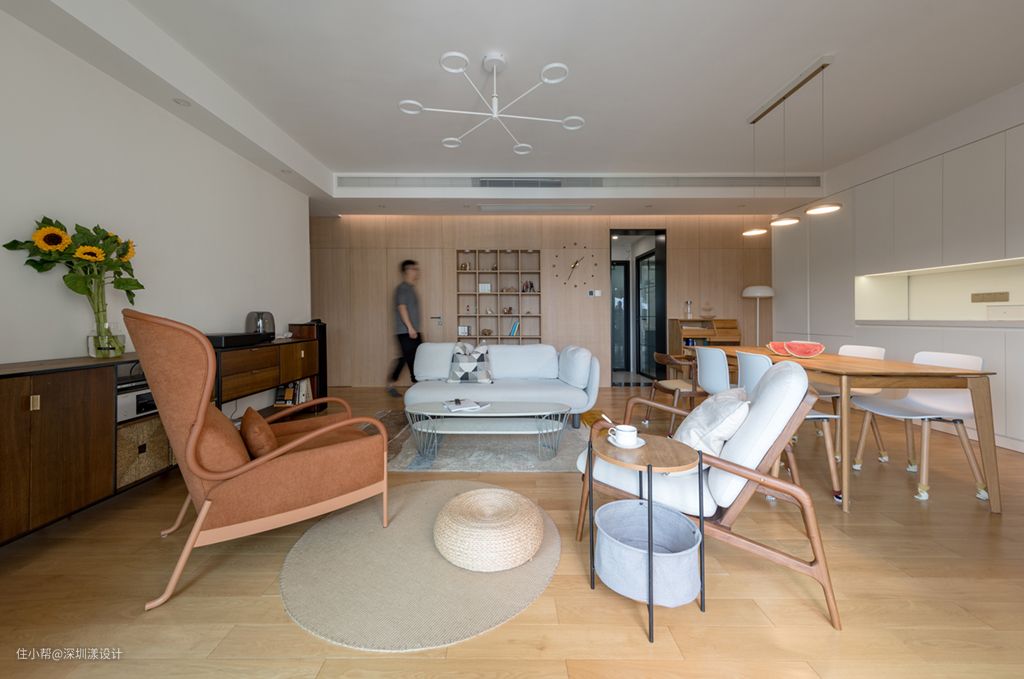 设计师结合户型特点和业主需求,通过简练的设计手法,将空间区域进行划分的同时又增加了空间之间的互动性,加上小软装的灵活运用,使空间变得格外灵动。素雅墙面、实木地板、休闲躺椅……这些素雅中带着特色的“日式元素”,逐步勾勒出业主理想中的新家,给人一种温暖、舒适的感觉。