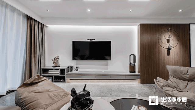 现在大多数的设计重心都会放在电视背景墙,但设计师在这套作品中,特意让电视背景去繁就简,朴素的天然木饰面与几何电视柜就是整个电视背景的表现点。