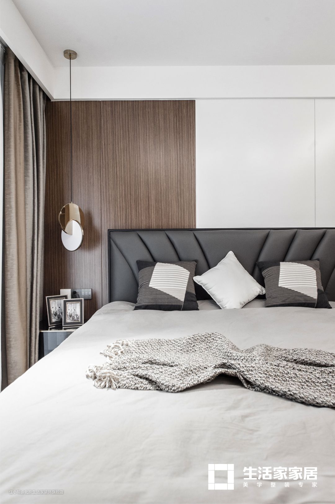 因为有单独的衣帽间,主卧并没有设置收纳系统,软装的挑选以简约风格为主,除了床品和吊灯之外,其他视线所及之处均采用木饰墙板做效果。