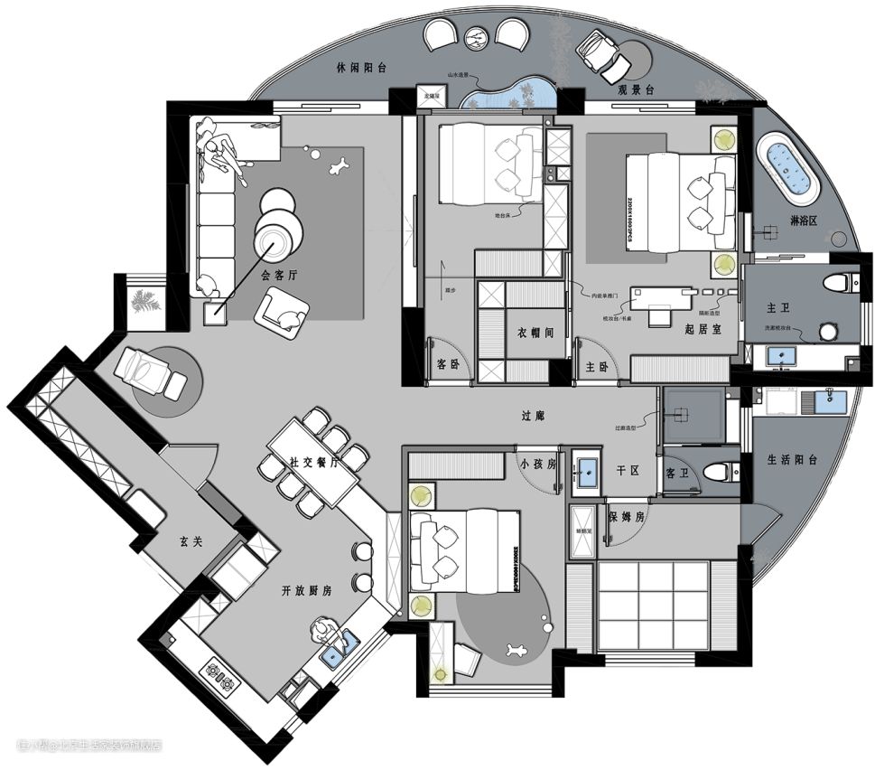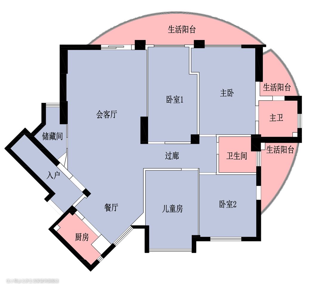 本案是改善性住宅,业主想把住房重新规划装修,主要是提升整体的居住品质。原始户型有些异形,存在弧形与斜边,不过整体的采光性与通透性又非常出色。