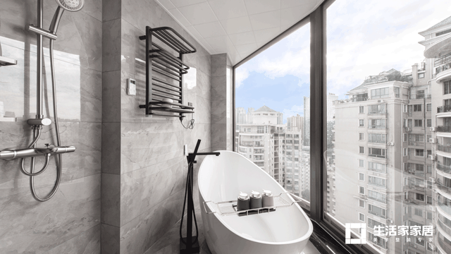 干区连通生活阳台,把浴缸直接放置在阳台,搭配整面落地窗,直接提升沐浴体验感。百叶窗可以自由调节光线亮度,也起到隐私保护的作用。