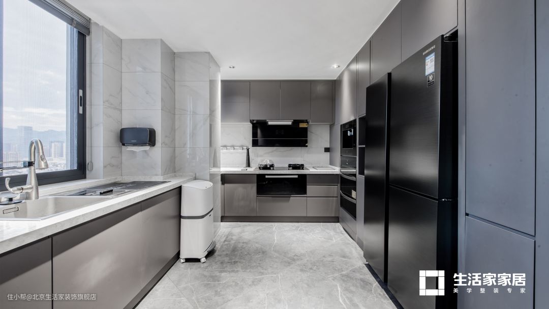 厨房为U型布局,左侧为操作台与清洗区,最里面为烹饪区,右侧为定制的集成式橱柜,配备了双开门大冰箱和各式大型厨电,其他空间都用作收纳柜,提升了厨房的储物能力。