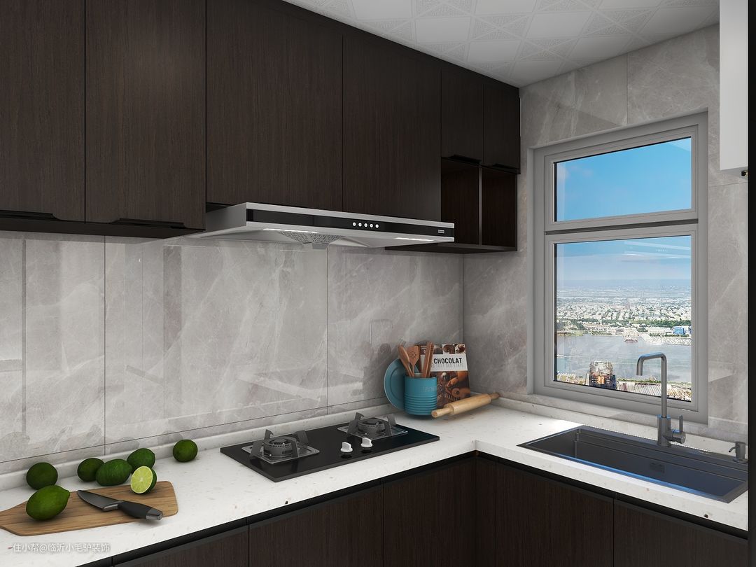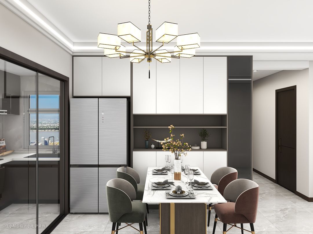 本案例风格偏向新中式风格,整体简约为主,没有复杂的造型以及背景墙;主要通过软装家具以及卧室的柜子来体现新中式风格,餐厅做了餐边柜酒柜,冰箱内嵌。