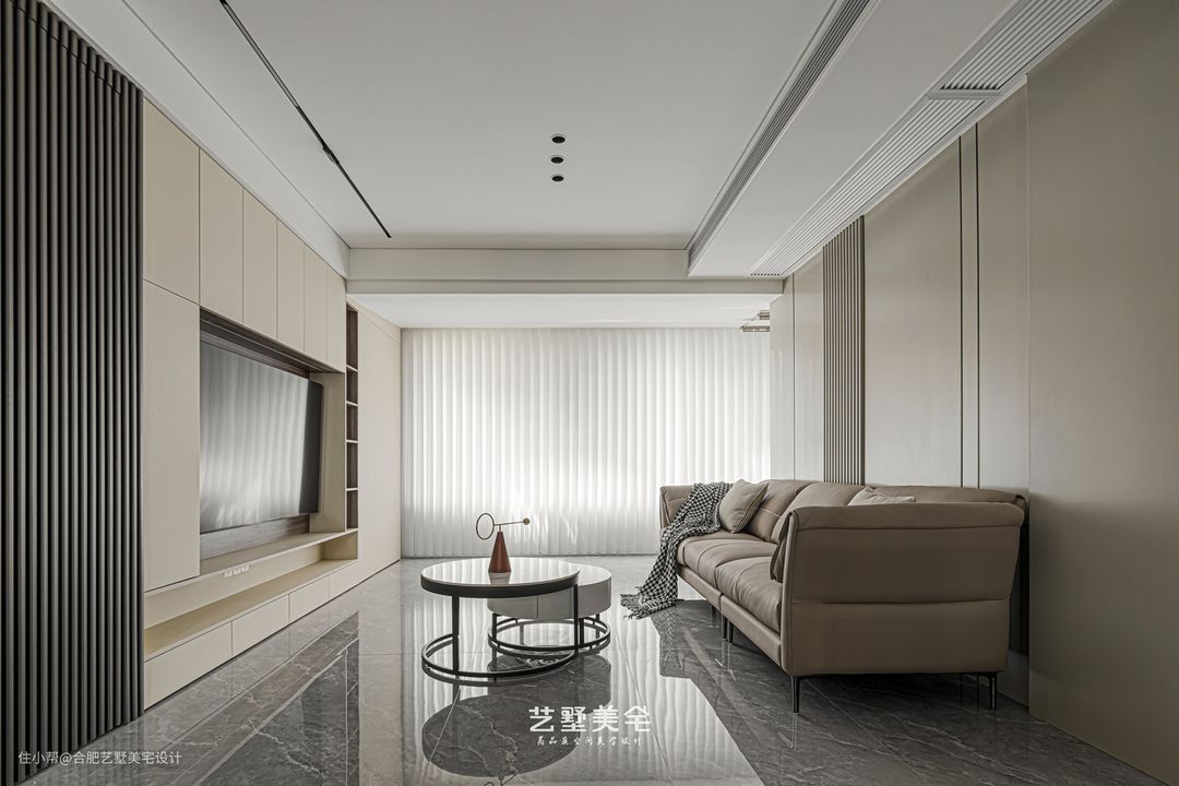 对于很多大宅业主来说,更喜欢简单高级的极简电视墙样式。比如台州吾悦别墅这家,无柜体设计,岩板、格栅和石材三种材料做拼接样式的背景设计,无过多装饰,看起来就很有气派了。