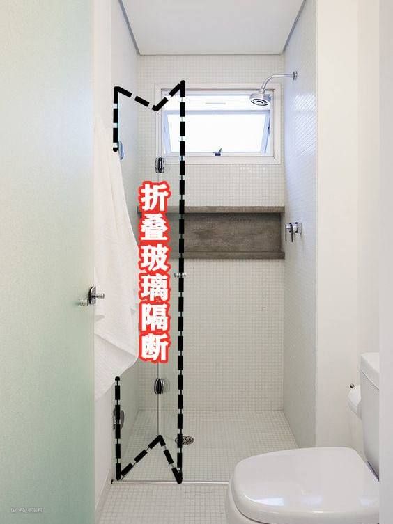 这种隔断方法可以理解为玻璃材质的“浴帘”,在不使用淋浴时,可以将门收起来增加卫生间的活动面积,隔断效果比浴帘好,又极大程度降低了业主的行动受限问题。