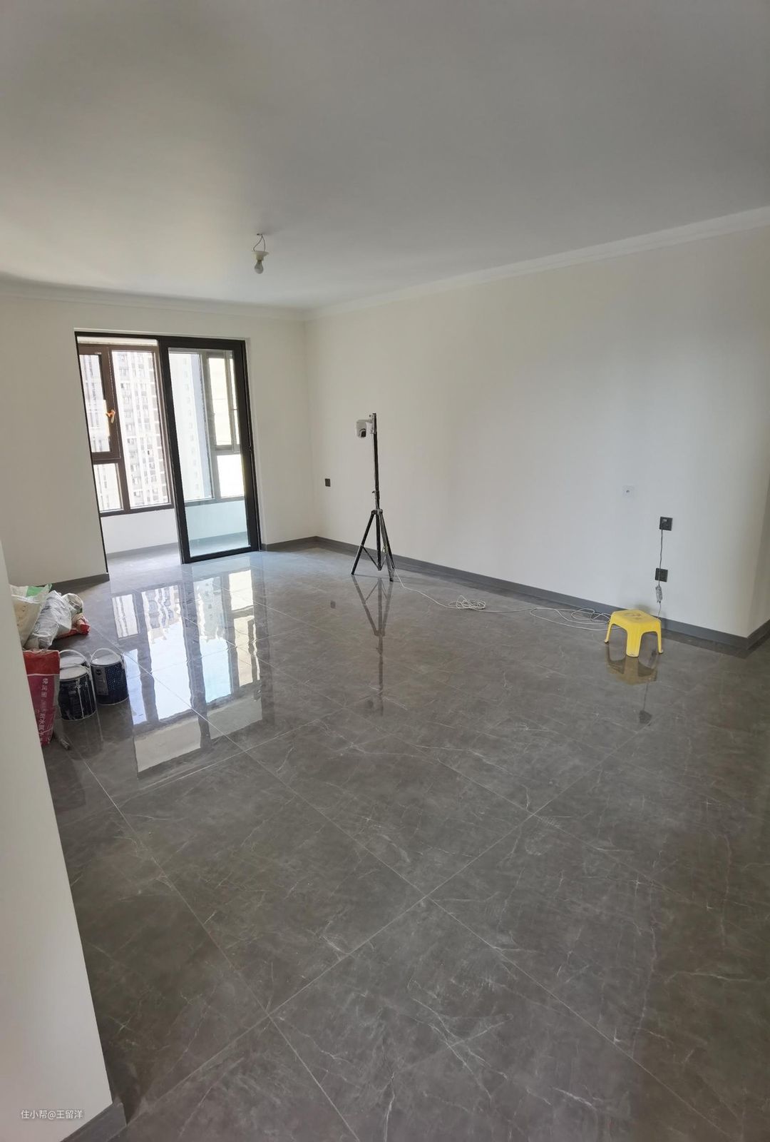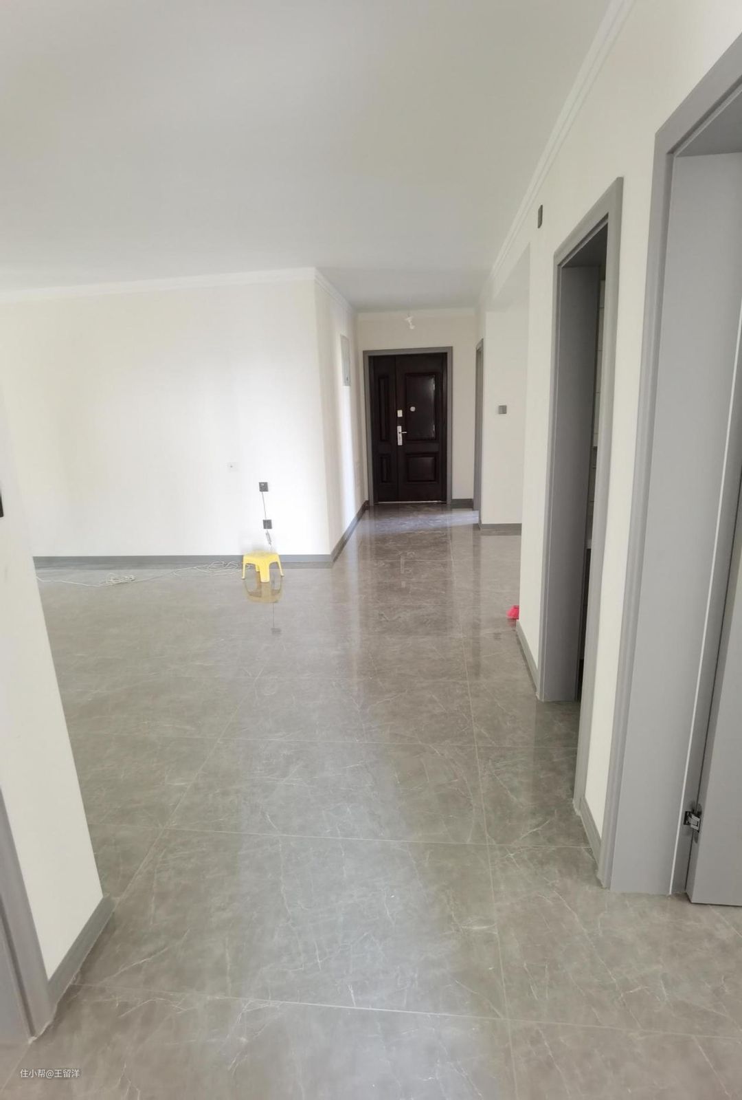 房间门的颜色几乎与地砖相同,连接灰色踢脚线,整个空间色调简洁,高级感炸裂,墙面选杏子灰乳胶漆,比传统灰色更加温馨,更有家的温度。