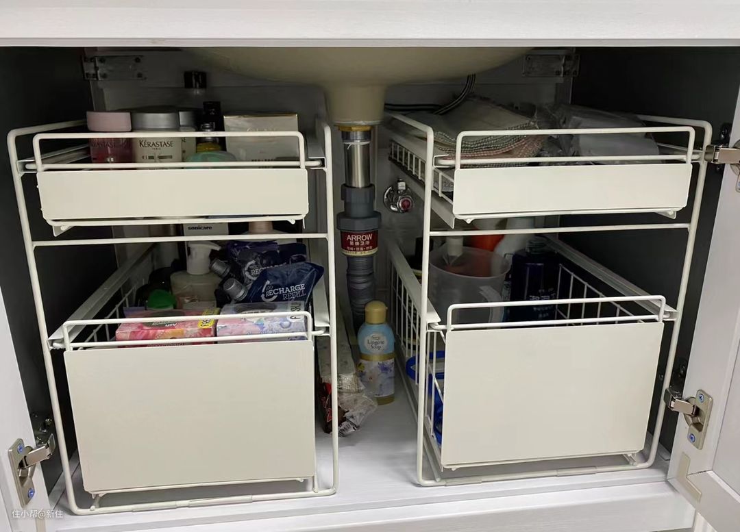 若家里已经是平开门浴室柜,可利用收纳拉篮,进行改造。