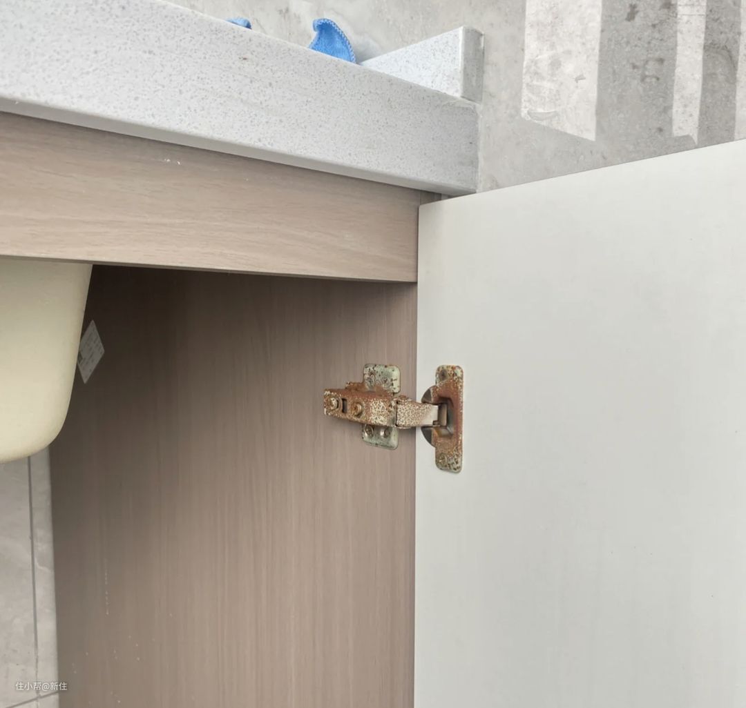 卫生间环境潮湿,五金本身的质量要格外重视,包括铰链、抽屉、抽屉滑轨,生锈的情况屡见不鲜。