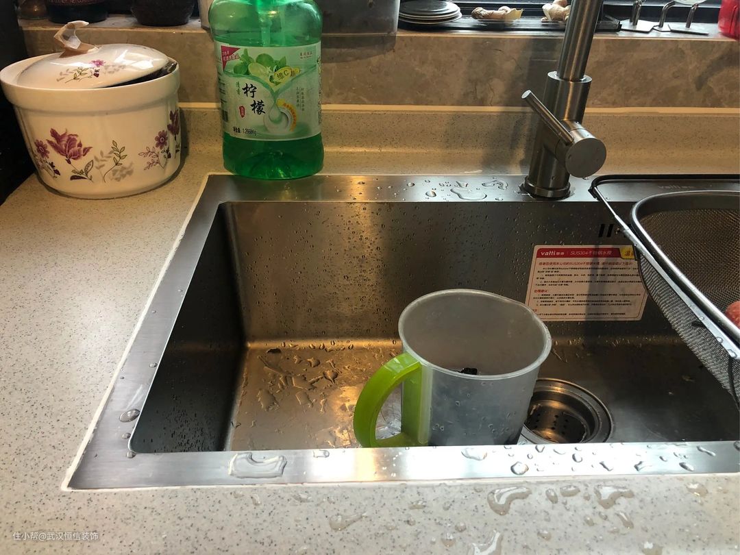 缺点:后期使用中打理起来不太方便,水槽边和台面接触的位置是打玻璃胶封闭的,如果卫生保持得不好,时间一久玻璃胶容易发霉、变黑、水槽翘角、顺着缝隙漏水到橱柜里。2、菜盆边缘是高于台面一点的,台面上的水,用抹布不好往菜盆里赶。