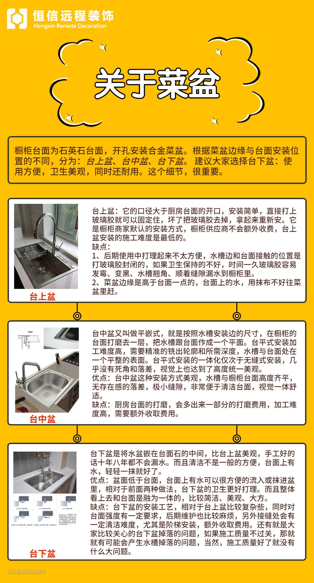优点:它是橱柜商家默认的安装方式,橱柜供应商不会额外收费,台上盆安装的施工难度是最低的。