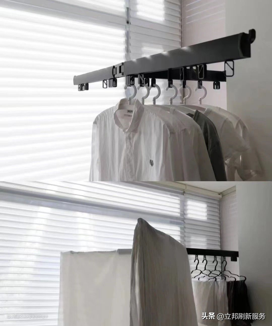 房间小且没有阳台或者阳台空间不够的朋友,可以试试这种固定式晾衣杆,材料是镀锌钢管,结实耐用。只需要安装在阳台的墙垛之间即可。