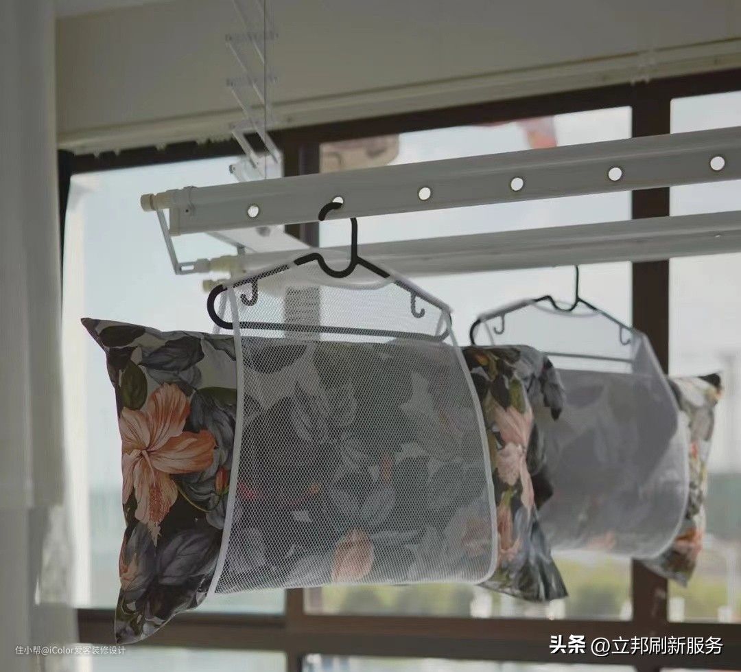 专门的可折叠枕头晾晒架,可以将枕头平放在架子上晾晒,非常方便。不用时还可以折叠起来放在家政柜里,或者和衣架挂在一起。