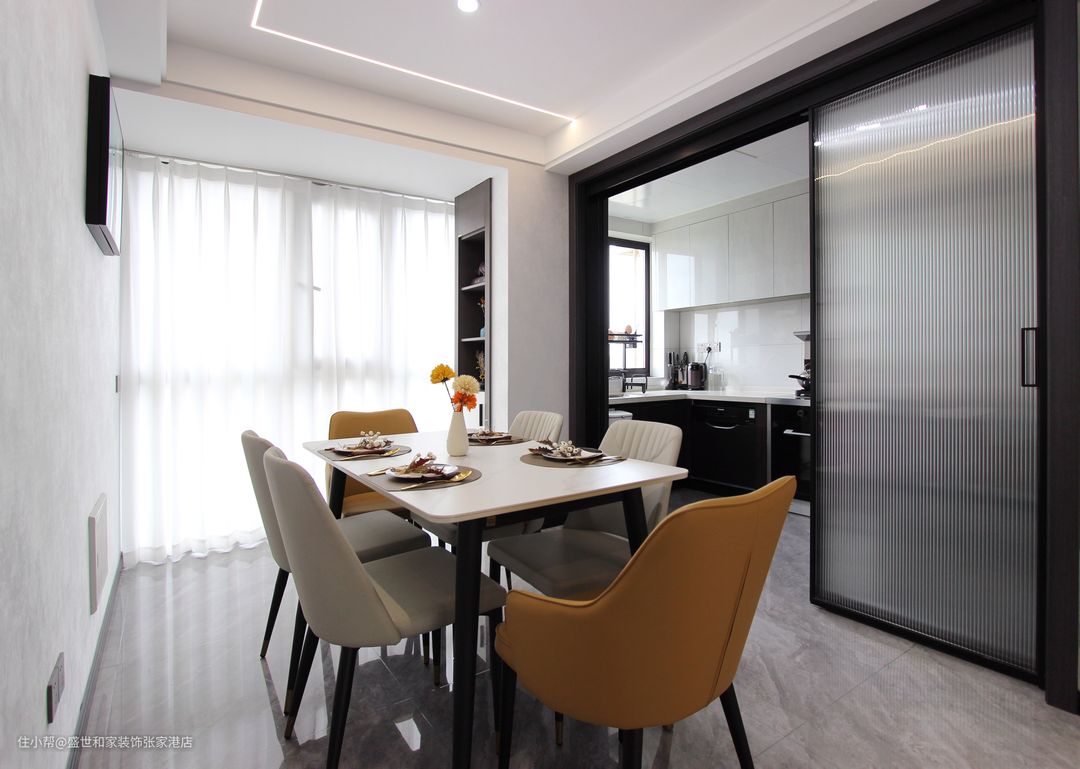 厨房采用长虹玻璃联动门做隔断,可以起到采光和隔绝油烟作用,增加美观,有利于改善用餐氛围。