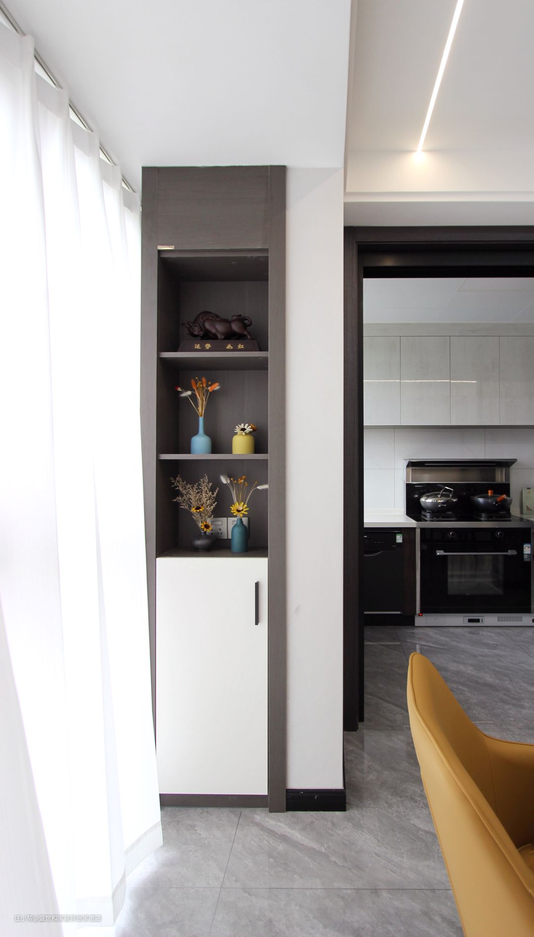 飘窗一侧打造壁龛式柜体收纳,放置装饰品、书籍等,实用美观。