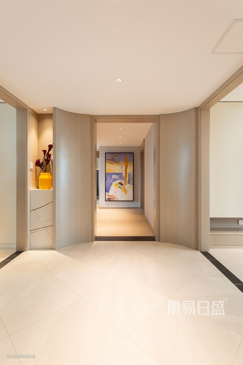 设计采用现代风格,入户的仪式感在具有视觉张力的圆弧形造形,无主灯的客厅满足了更多的灯光情景模式,永恒简单的构造,通过设计节奏来传达业主内心观照。