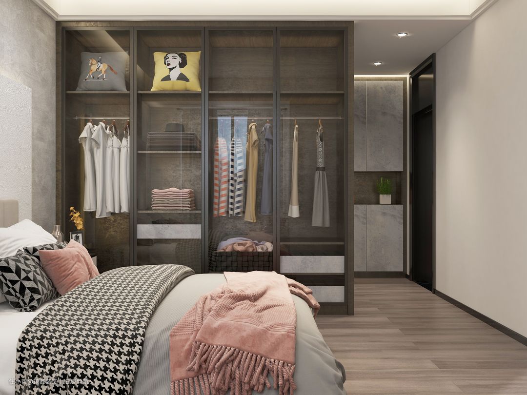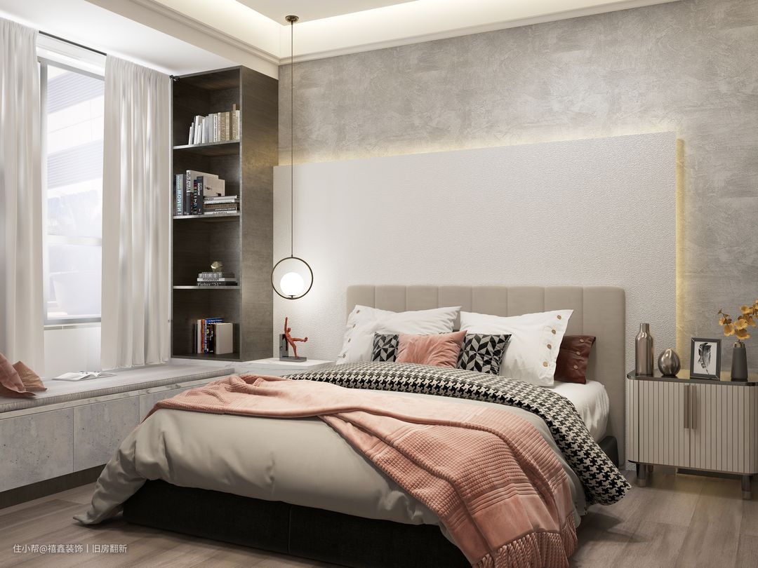 【主卧】主卧墙面运用两种不同的材质,磨砂质感的艺术漆搭配白色颗粒感的石材,搭配灯带,背景墙层次丰富,却不繁杂。飘窗侧面也打造了收纳柜,满足夫妻俩的日常收纳。