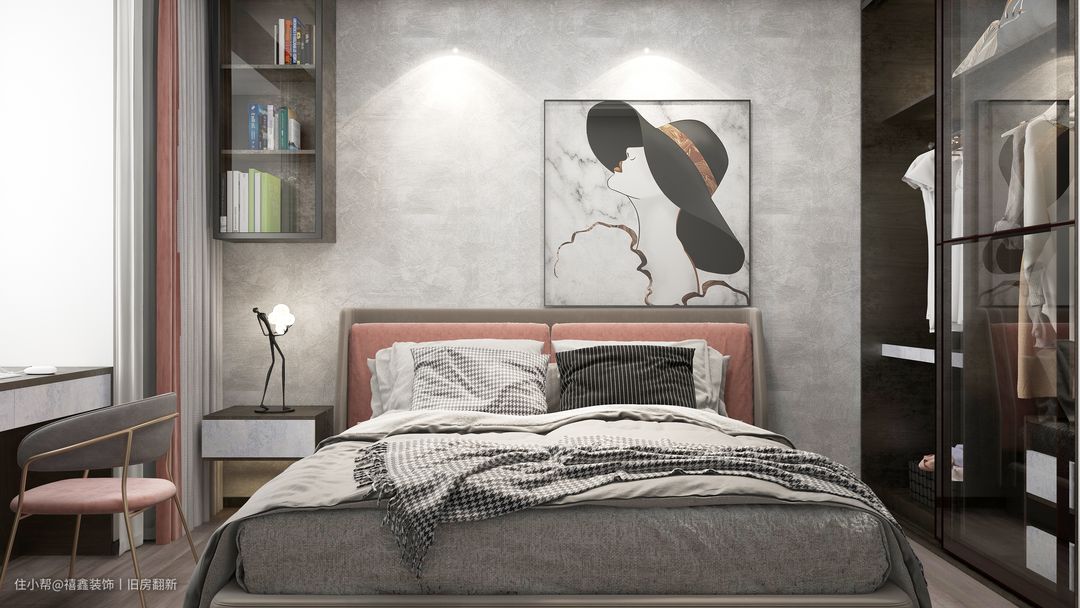 【次卧】女儿房延续磨砂质感的墙面,搭配简约的线条挂画,柜体采用玻璃柜门,更显高级,悬空的床头柜,减少死角和压抑感。靠窗打造了一个小书桌,满足平时游戏办公的需求。