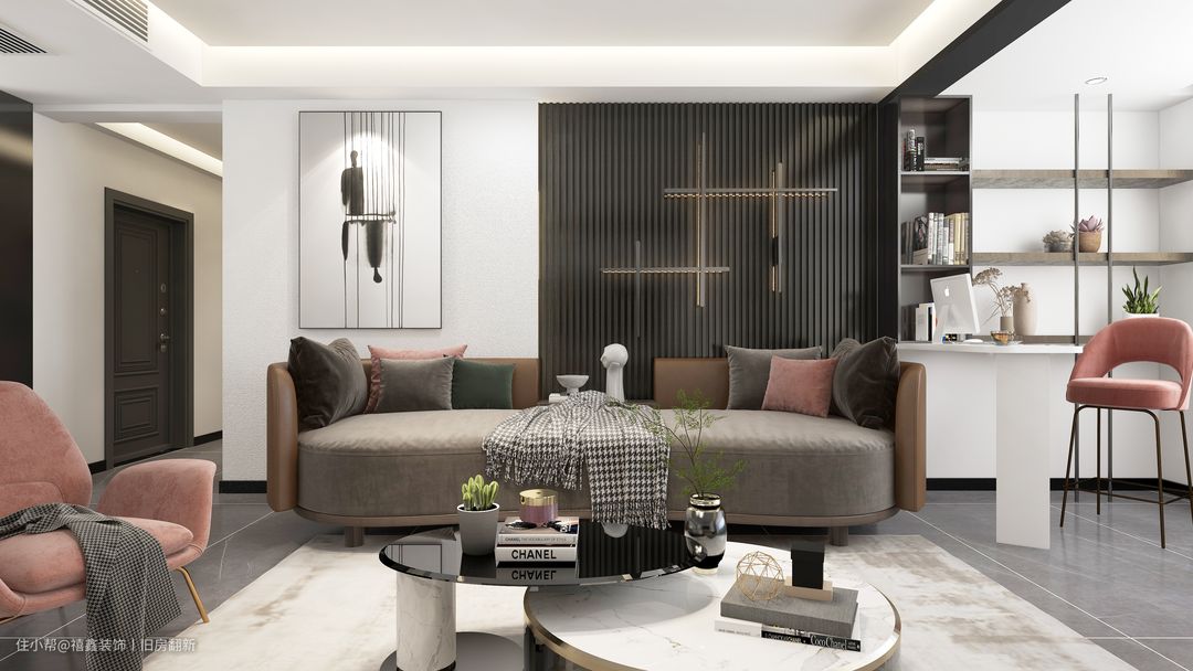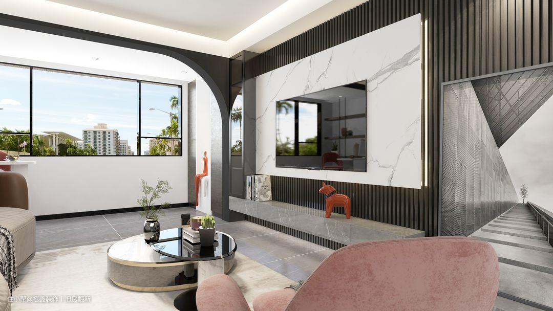 【客厅】大理石底座+金属台面的组合茶几,摆放上现代感的装饰品,整个空间非常的华丽精致。一侧是粉色绒面的休闲椅,在简约的氛围中增加了一丝温馨感。