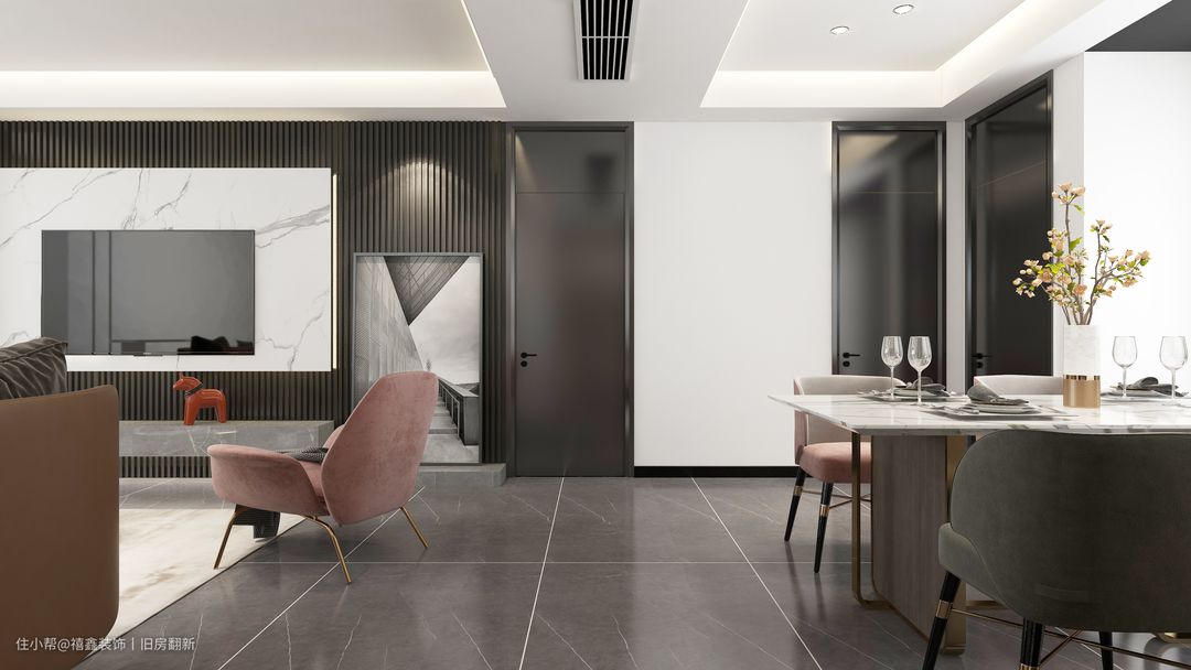 【餐厅】客餐一体的设计,通铺黑色大理石,金属元素的融入,让用餐空间更具轻奢质感,绒布的餐椅增加空间的层次。侧面是一整面墙的餐边柜,暗红色的格栅板作为开放格的装饰,让用餐空间更具时尚张力。