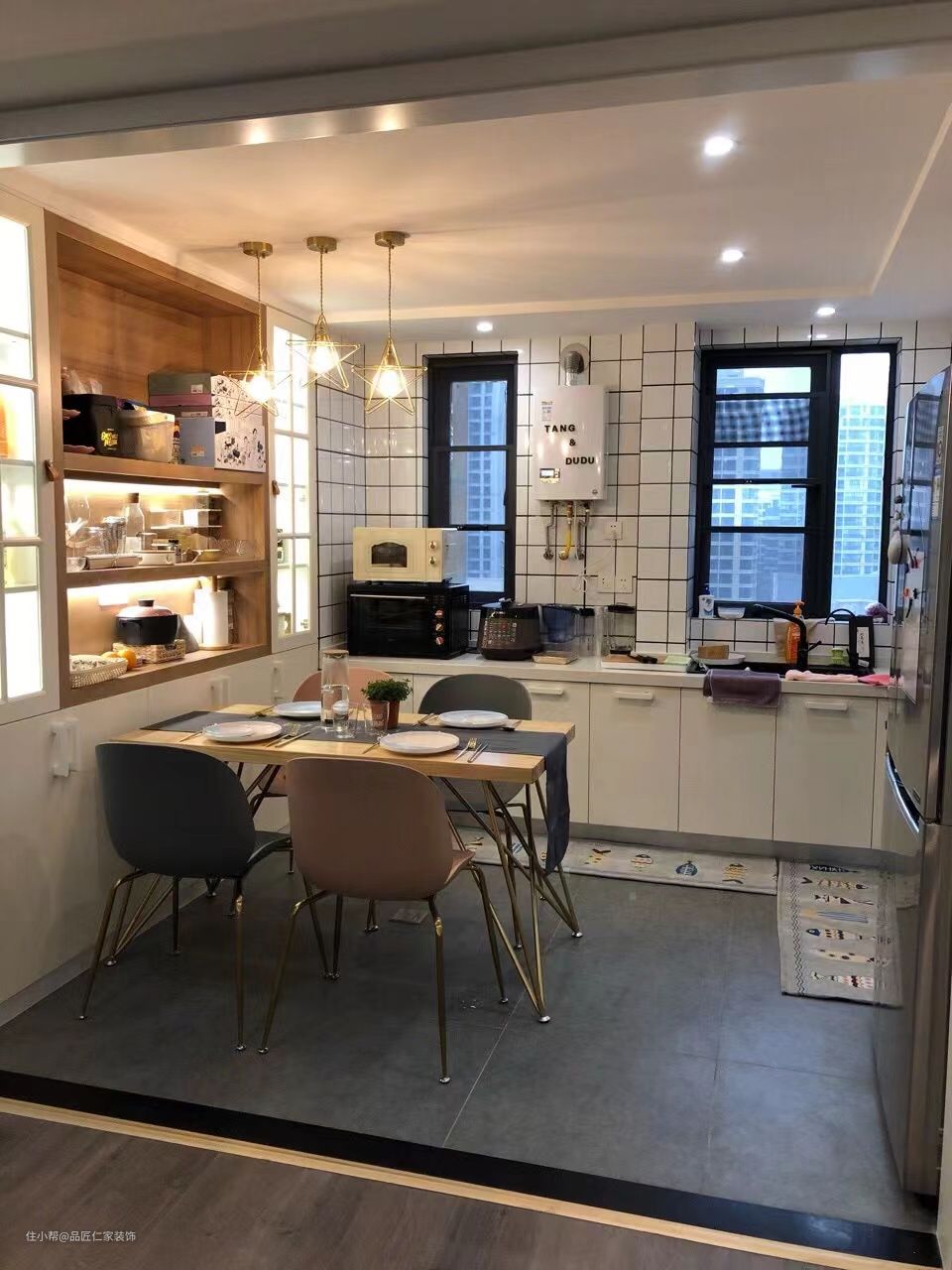 餐厅的设计则就这套设计中的点睛之笔,同样,地板抛弃了浅色木质,而是运用深色的瓷砖铺设,营造类似酒馆的暗调气氛,墙边柜和餐桌则保留北欧风的原木色设计,在椅子和灯饰上,采用了一些金属元素,也是模仿酒馆的设计质感。再加上美式ins风格的开放式厨房混搭,加上暖色的灯光,让这个不大的 餐厅空间,一下子变得浪漫且温馨。在这样的环境中跟你的爱人或者朋友一起小酌畅谈,我想一定不会比外面的小酒馆差吧~