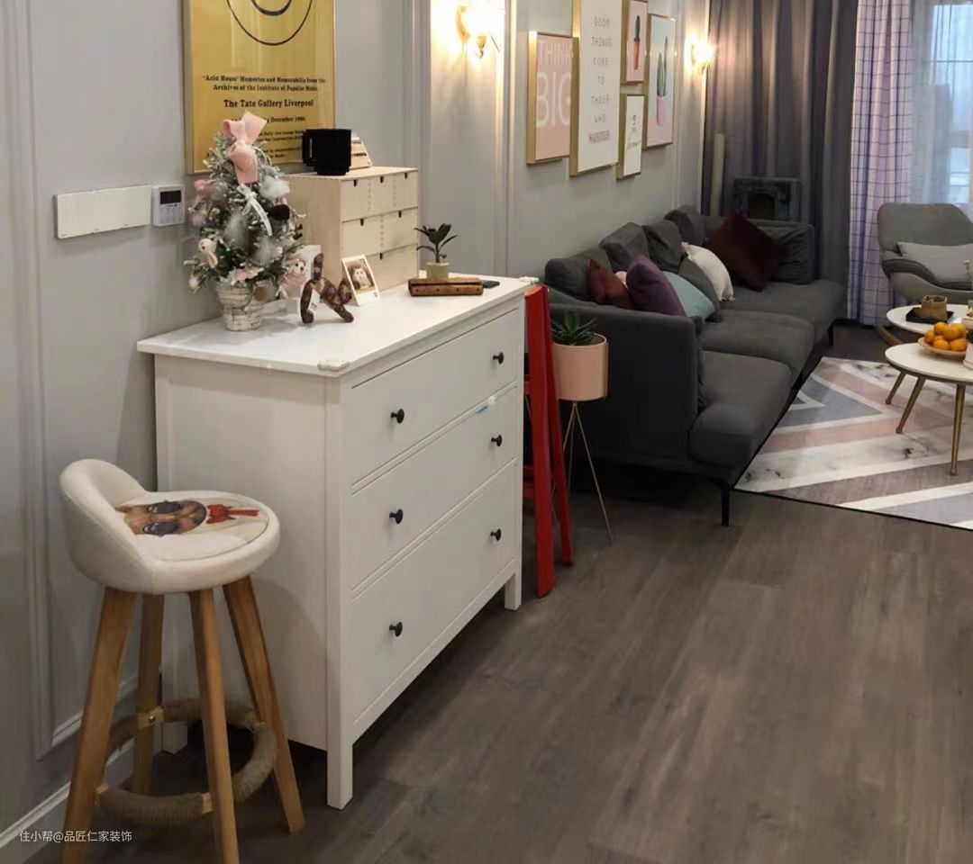 还有两个细节也是打破了传统的北欧风格定论,一是地板采用了颜色较深的木质地板,在我们大多数人的印象中,北欧风就一定是浅原木色的地板,来搭配整个空间,而这份深色,却带来了不一样的感觉。另外沙发背景墙上大小不一的不规则排列版画,让整个空间比传统的北欧风格显得更加饱满。