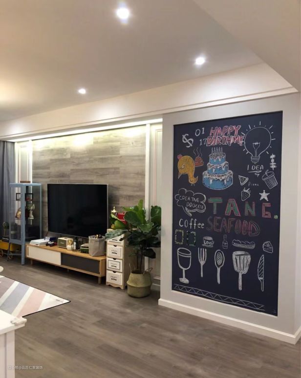 乍的一看,简明干净的线条、大面积的浅色调色块涂装,搭配上大量精致的木质家居和地板,这是典型的北欧风格特点,但是仔细一看,又有了很多不一样的元素。这里最显眼的就是这块大大的仿黑板墙饰,加上饱满动感的绘画,这里颇有几分美式涂鸦的感觉,大面积的墙绘局限在规整的空间里,让房屋充满活力又不会显得冗杂。