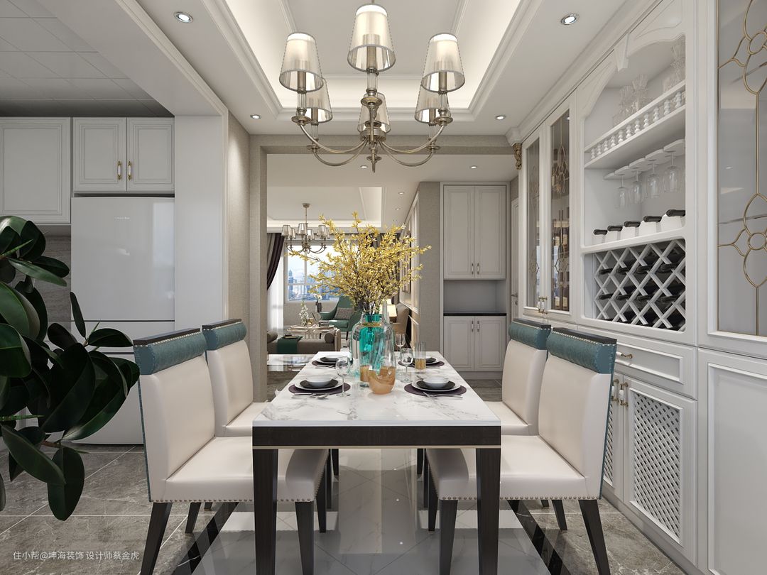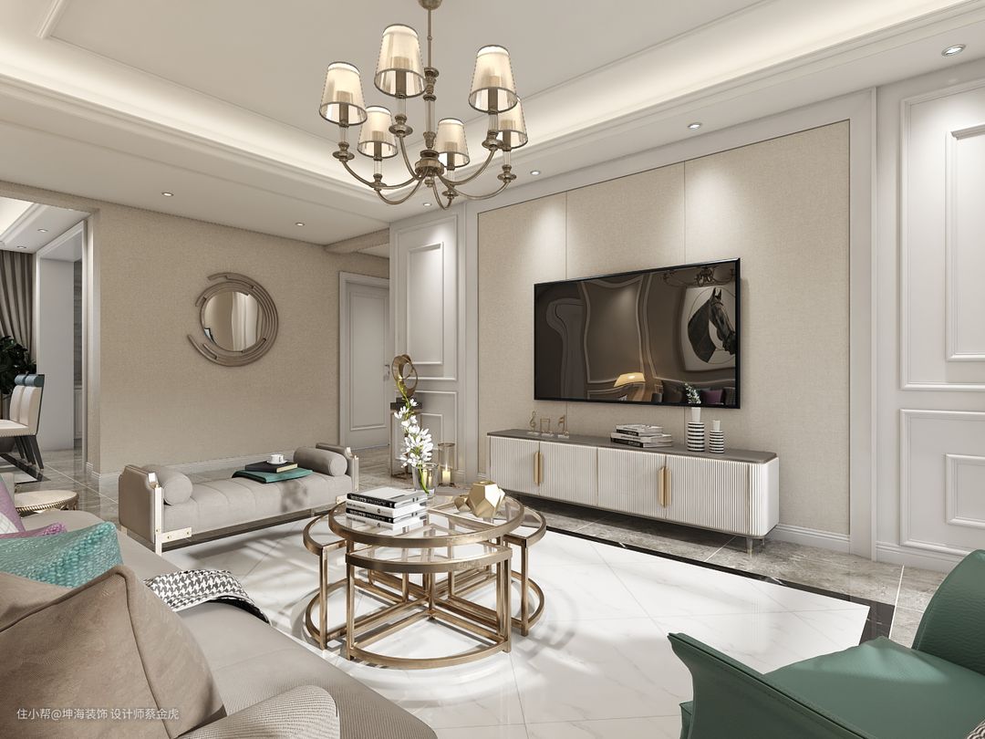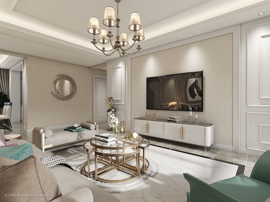 形状各异的镜子装饰已经成为独特的装饰。欧式客厅的吊顶设计是非常棒的。处理的很细致,整个空间在灯光的融合下尽显轻奢大气。