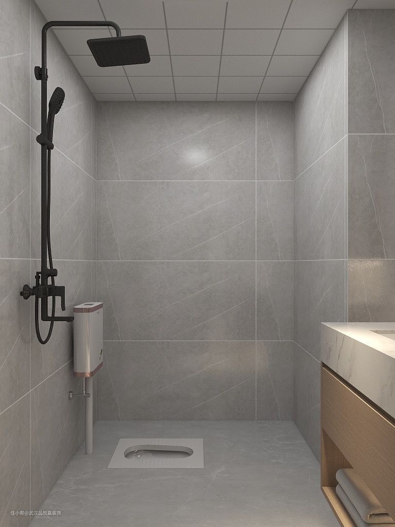 卫生间灰色系瓷砖通铺,设计蹲便器干净卫生!