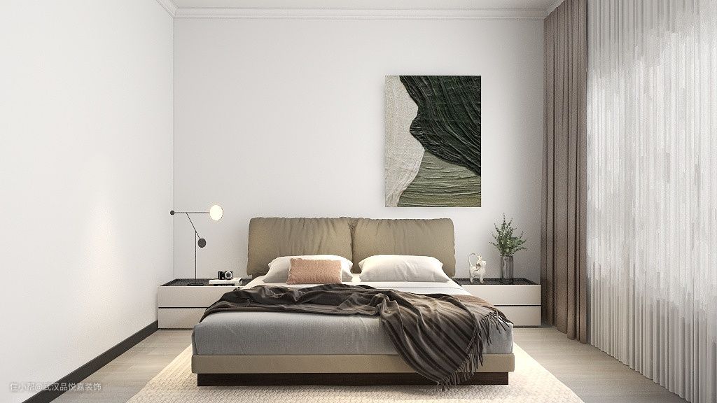 灰色床垫搭配床头夜灯设计给人带来温馨舒适的氛围感,背景墙放置艺术挂画也让整个卧室空间情绪氛围不在单~