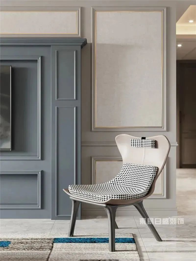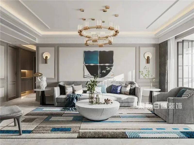 灰色又是经典百搭的色系,在此基础上,不同深度的蓝在墙面、沙发以及地毯上零星分布着,条纹、千鸟格元素加以点缀,浸润出安逸闲适的生活情节。