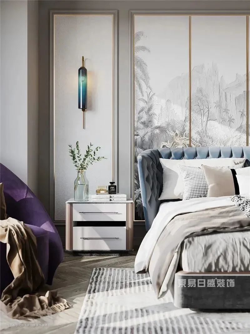背景墙绘上一幅淡然悠远的丛林画卷,灰白二色也能展现出葱茏的植株,整体用色虽淡雅,但富有层次。雾蓝色床头靠背温润亲肤,高级灰床品绵软舒适,贴心地呵护居者的每一个夜晚。