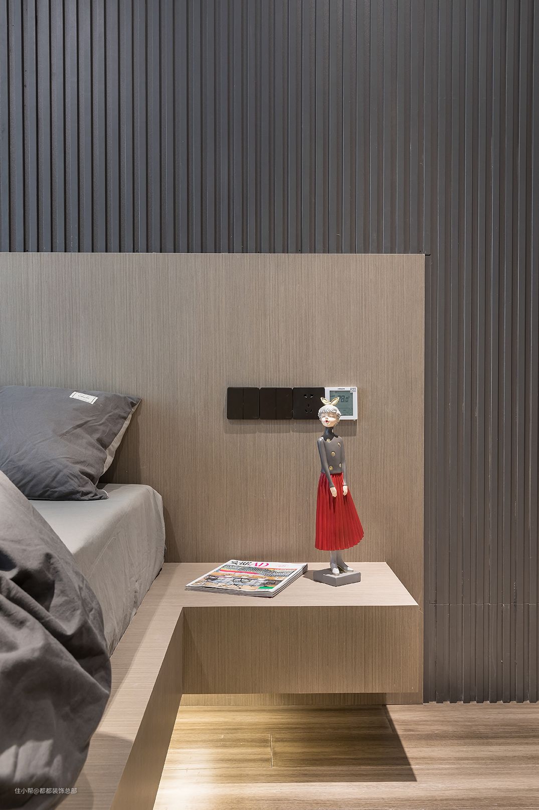这是一套现代简约风的卧室,整体空间呈现出沉稳儒雅的格调,设计师把温润儒雅的原木和现代简约风格相结合,从卧室的黑色格栅背景墙开始与床头严丝合缝。