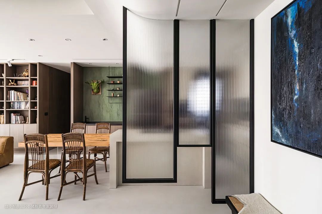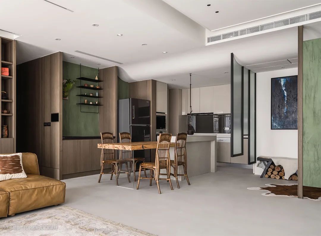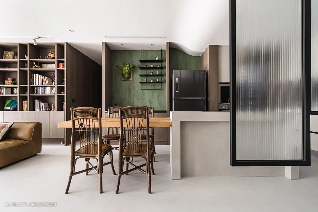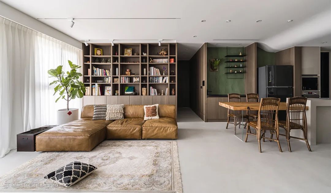 我太喜欢这个大开间客厅了,抓住我眼球的不是电视墙,而是沙发背后的那排书柜充满文艺气息和古朴的陈旧意蕴。且采用大面积的留白,在原木的点缀下,让家有足够的空间自由生长。