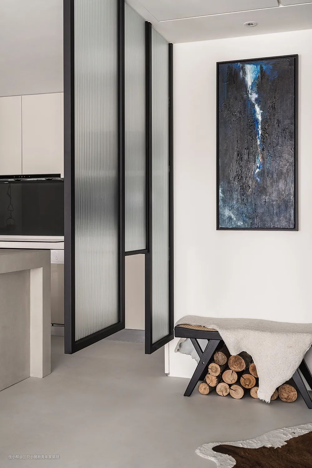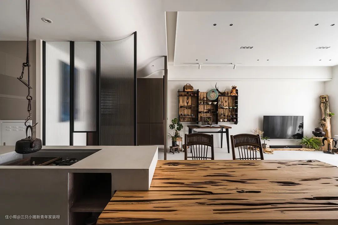 左侧悬挂着的黑色茶壶,不仅仅是装饰,下方的火炉可以让茶壶像在山林间一样使用,可以说是现代生活蔓生出山林间的质朴。