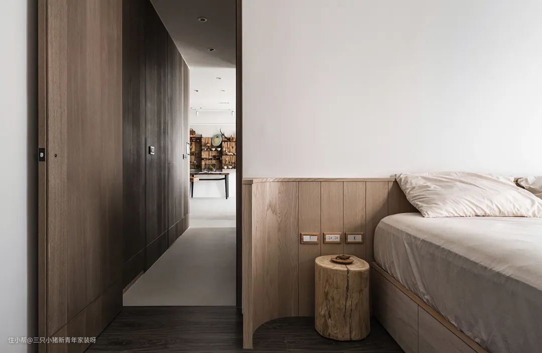 床旁用一节原木墩做床头柜,自然又率真。